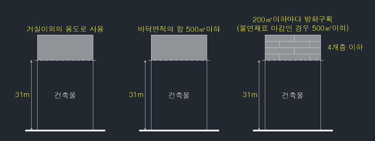 따라서, 층수는 10층 이상이면서 높이가 31미터를 초과하나, 높이 31미터를 넘는 각층을 거실외의 용도로 쓰는 공동주택의 경우, 「주택건설기준 등에 관한 규정」 제15조제2항에 따라 승용승강기를 비상용승강기의 구조로 하여야 할 것입니다.