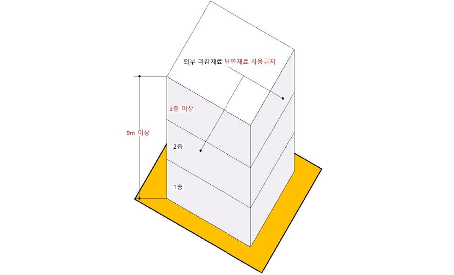 건축물 외부 마감재료의 난연재료 사용금지 대상 규모: 6층 이상, 22m 이상의 건축물 Ⓒ이재인