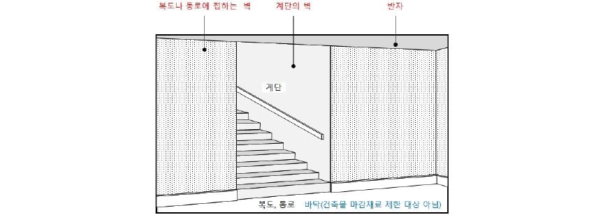 건축물 내부 마감재료 제한 대상 부분: 피난동선(계단, 복도 및 통로)의 경우 Ⓒ이재인